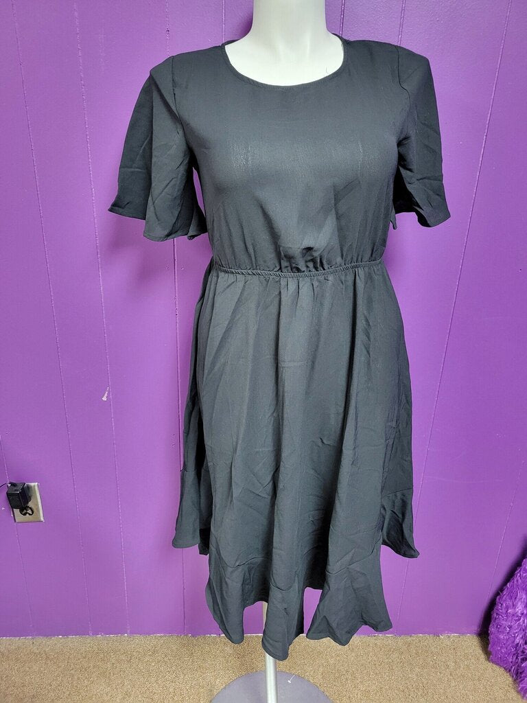 NEW ZATTCAS SHORT FLUTTER SLEEVE V NECK SMOCKED RUFFLE MIDI TIERED DRESS, BLACK, Size: MEDIUM