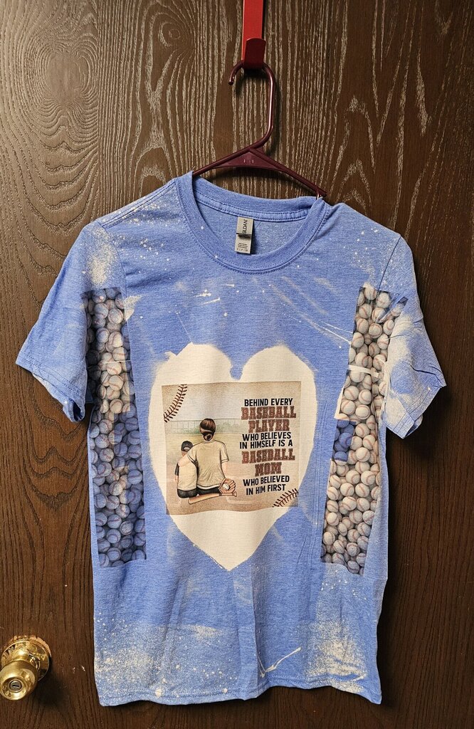 NEW GILDAN BLEACHED BEHIND EVERY BASEBALL PLAYER WHO BELIEVES IN HIMSELF IS A BASEBALL MOM WHO BELIEVED IN HIM FIRST, BLUE, Size: SMALL